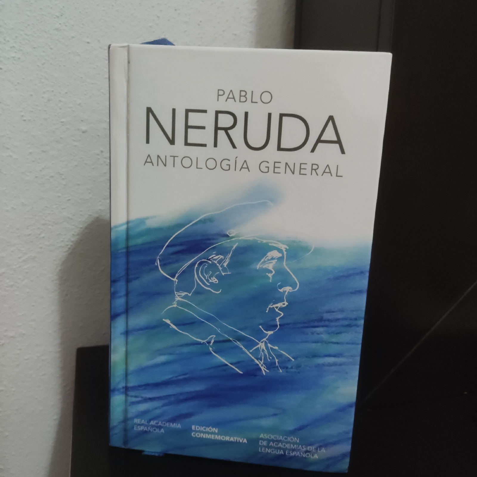 cuando veo esta portada de la edición conmemorativa de la RAE de Neruda recuerdo lo bien que me la pasaba leyéndolo, no deja mi recámara, tiene que estar cerca de mí, además de que es un libro muy bonito, sus colores, no es muy pequeño ni muy grande, tiene separador, es tapa dura pero sobretodo puedo acceder a uno de mis poetas favoritos. Leer poesía es intensidad, es leer pequeños versos, pequeñas estrofas que pueden quedarse en tu mente, pueden adentrarse a tu alma, estas solo tú y el poema. Porque el poema ya no es del autor, cuando lees un poema que te gusta, cuando lo aprendes y lo recuerdas ya es tuyo, esas letras aunque no salieron de ti se te quedan para siempre, las haces tuyas. Neruda me ha enseñado sobre el amor, sobre que para expresarte no necesitas ser tan complicado, sabe poner las palabras precisas para desentrañar los sentimientos. Cuando leo a Neruda late mi corazón fuerte al son de sus palabras.
